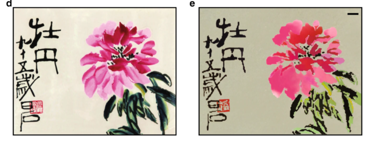 实际上,研究团队为验证该系统的可行性,印刷了齐白石的水彩画《牡丹》(下图左为数码复制品),可以看出,其作品中主要包含几种很常见的颜色,如红色、粉红色、黄色、绿色及黑色。研究人员表示,只需简单地调整透明腔体的厚度,就能以极高的色彩精度重现原作(下图右)。