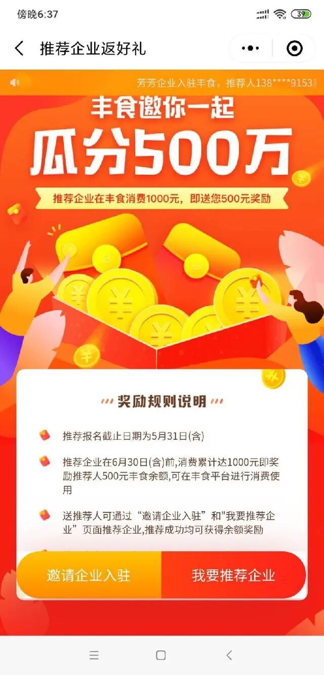 先抢商家,再抢用户,顺丰甚至玩起了“补贴价格战”的游戏。丰食推出了“瓜分500万”的活动,用户可通过“邀请企业入驻”和“我要推荐企业”页面推荐企业。奖励十分诱人——企业成功入驻后,推荐人将获取1元奖励。而推荐的企业6月30日前在丰食消费1000元,推荐人还可另外获得500元奖励。