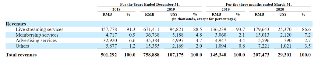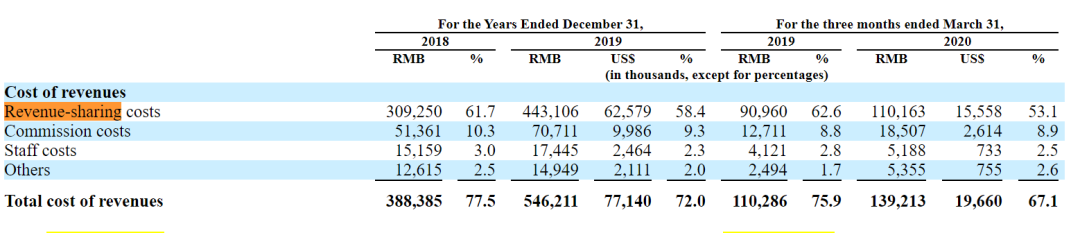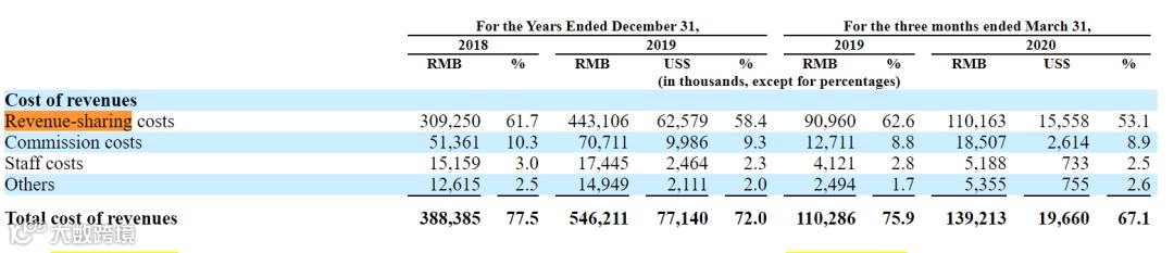 Blued将这部分分成收入计入营收成本中。根据招股书,2018、2019年和2020年第一季度,Blued的分成费用分别为3.09亿元,4.43亿元和1.10亿元,分别占总收入的比例为61.7%、58.4%和53.1%,占同期直播收入的比例为68%、66%和61%,也就是说平台的直播抽成比例大概为3成。