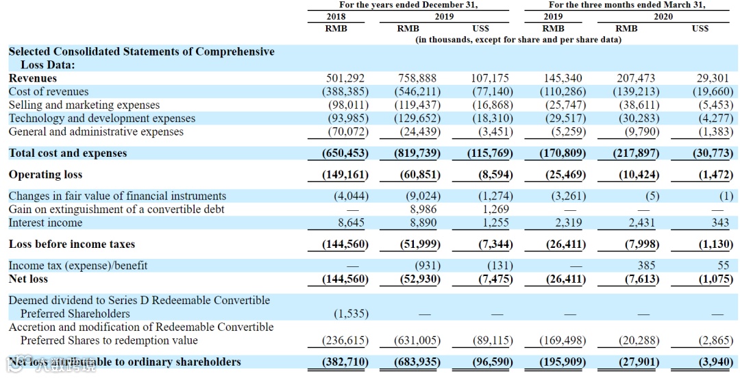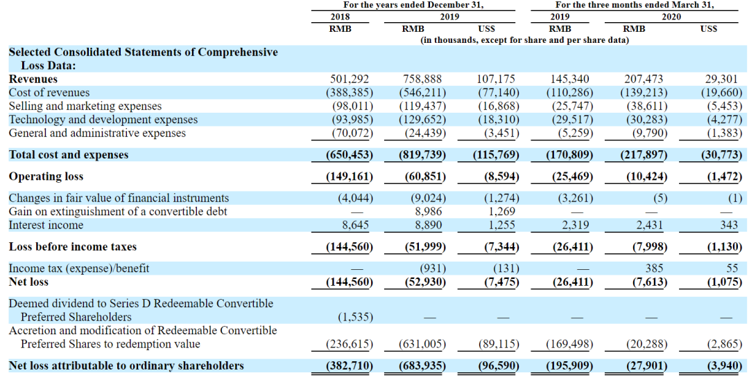 财报显示,2018年,2019年和2020年一季度,公司营收分别为5.01亿元、7.59亿元和2.07亿元。