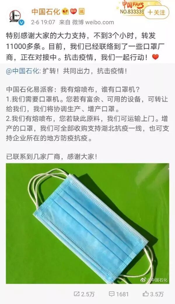 2 月 6 日,中国石化也官方微博称,在拥有大量熔喷布(雷锋网按:“熔喷布” 俗称口罩的 “心脏”,是口罩中间的过滤层,是生产口罩的重要原料)的情况下,征集口罩机,并且可以为口罩企业提供运输上门服务,增产的口罩,将可以全部收购支持湖北抗疫一线,也可支持企业所在的地方防疫抗疫。