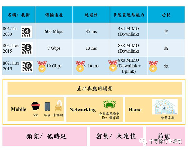 而2019年9月商用化的Wi-Fi 6,技术无不想满足在上述市场探讨产品与场景应用,如智能型手机、XR与车联网等需求,规格因此往更大频宽与低时延面向迈进,在企业等级的网络中,如:体用场、演唱会而须突破密集连接等性能,还有因应未来智能节能家庭趋势,所做的新规格演进。