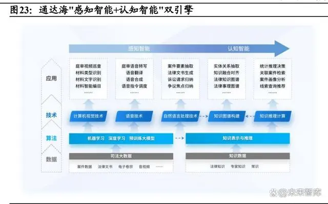 通达海联合基层法院共建大模型,展现出法律科技公司服务基层的新路径。2024 年 10 月,通达海与香洲法院共建的香法 AI 入驻珠海模数空间,该产品实现了标准化法律业务指引、精准化法律知识推送、智能化司法决策辅助 等功能,并已在审判实务中显著提升效率。通达海构建了"感知智能+认知智能"双引擎的法律人工智能架构。感知智能 引擎通过图像识别、OCR 识别等技术,对卷宗、证据等实体材料进行智能 分析,实现材料类型识别、内容识别和精细化编目,其中 OCR 综合识别正 确率达 95.5%,证据材料综合识别率达 98.5%;认知智能引擎则基于自然语 言理解和法律大模型技术,构建了 280 多个要素化信息抽取模型,在法律 咨询、量刑预测、智能文书生成、案件事实归纳等九大核心场景实现了 95% 的模型准确率和召回率。