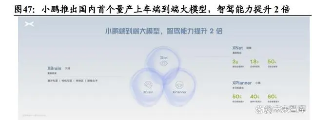 小鹏汽车率先推出了国内首个量产上车的端到端大模型。根据小鹏 520 AI DAY 披露,其端到端解决方案包含深度视觉感知神经网络 XNet、规划大模 型 XPlanner 和大语言模型 XBrain 三个核心组件,通过超过 10 亿里程的视 频训练数据支持,实现每两天一次的快速迭代。这套系统显著提升了智能驾 驶性能,使前后顿挫减少 50%、违停卡死减少 40%、安全接管减少 60%。特别值得注意的是,基于这套端到端架构,XNet 能通过 200 万个网格实现 对现实世界的 3D 重构,感知范围扩大至 1.8 个足球场,而 XPlanner 则通过 海量数据训练实现更接近人类的驾驶策略。