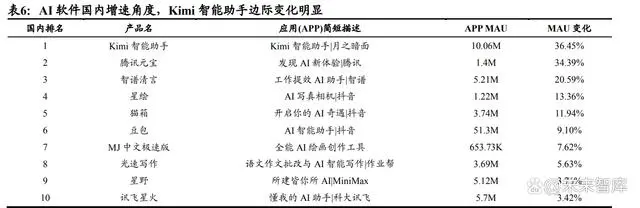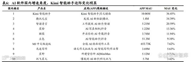 中国 AI 市场仍处通用平台竞争阶段,头部企业优势明显。AI 产品榜国内 10 月增速数据中,通用 AI 平台主导着国内市场增长,月之暗面的 Kimi 智 能助手以 36.45%的月环比增速位居增长榜首,日活跃用户突破 500 万;紧 随其后的是腾讯元宝(增速 34.39%)和智谱清言(增速 20.59%)。值得注意的 是,抖音系 AI 产品矩阵有星绘、猫箱、豆包三个产品全部进入增速前十, 体现出在国内 AI 市场快速普及阶段,大型科技公司正通过产品创新和规模优势持续扩大市场份额。