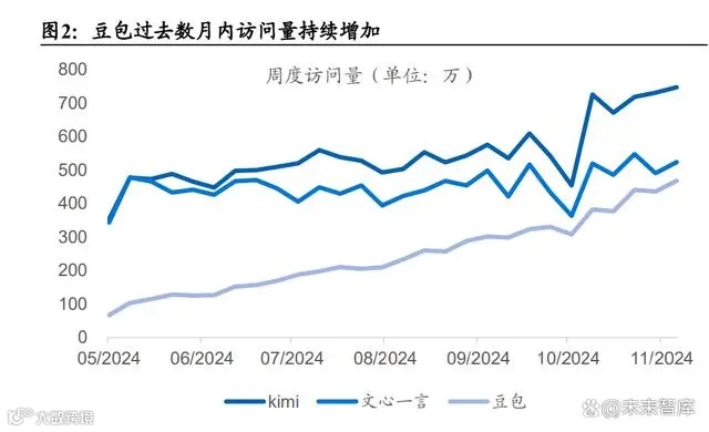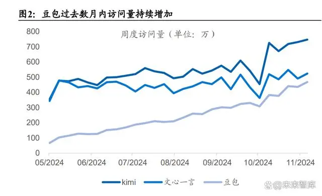 豆包 AI 凭借强劲增长势头步入国内 ChatBots 第一梯队。根据 AI 产品榜的10 月数据,作为字节跳动旗下的 AI 对话产品,豆包实现了 25.01%的环比 增长,访问量达到 17.13M,增速在头部 AI 产品中位居前列。此前以 Kimi 和文心一言为代表的头部产品分别以 29.28M 和 21.25M 的月访问量占据领 先地位,但其增速分别为 16.63%和 2.86%,相比之下,豆包凭借更快的增 长速度正在快速缩小与头部产品的差距已经成为国内AI对话市场新的重要 竞争者。