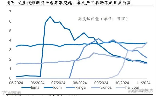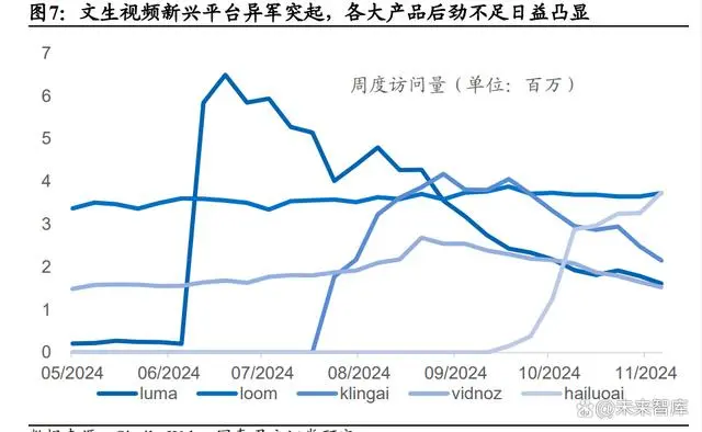 AI 文生视频领域新兴平台异军突起,但产品生命周期短暂、后劲不足的特 征也日益凸显。根据 SimilarWeb 的数据,进入者如 KlingAI 和 HailuoAI 展 现出惊人的增长速度,尤其是 HailuoAI,从 9 月中旬开始迅速崛起,到 11 月初已超越 Loom 成为行业流量冠军,周流量突破 370 万。与此同时,从数 据中可以观察到AI文生视频产品往往在一个大幅提升后容易陷入颓势的特 点,这种现象可能源于 AI 文生视频的商业化价值尚未被充分挖掘,目前用 户多出于追求新鲜感而使用,缺乏持续的使用动力,AI 文生视频在用户留 存和商业化方面仍需进行更深入的探索。