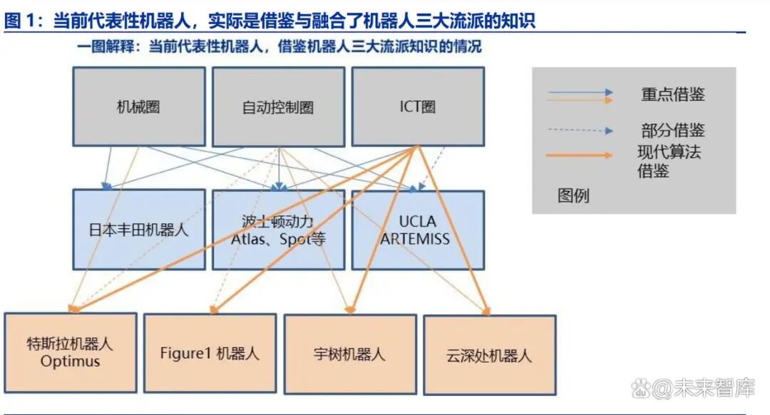 依照三大流派的思路,可以得到主流机器人倚重的知识和流派。例如丰田机器人、波 士顿动力 Atlas、UCLA Artmiss 主要依靠自动控制,不同程度的倚重机械与 ICT。而近期 的特斯拉 Optimus、Figure1、宇树科技、云深处科技,主要倚重 ICT 流派的思路,也融入相对成熟的机械、自动控制思路。宇树科技、云深处都强调强化学习、多模态,前者还 额外强调本体感知控制。这都是近年 AI 的思路。