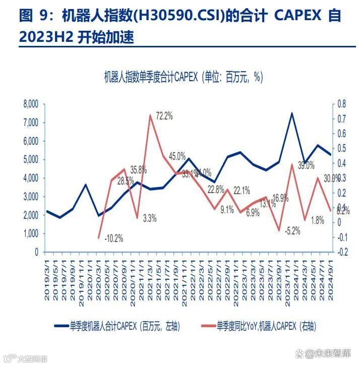 CAPEX 季度趋势或验证智能车对机器人的“技术外溢”。可以看到,同 比增速的高点出现在 2021 年内,而总额的高点出现在 2022 年内。而机器人指数(H30590.CSI)、二级行业自动化设备(属于机械行业)的 CAPEX 自 2023 年末开始加速(2023 年中是低点)。智能车 CAPEX、机器人 CAPEX 的此消彼长, 或辅助论述“技术外溢”,即智能车硬件投入的高峰期,可能平移到了机器人相关。除了定量分析,下面具体环节的定性分析,可以帮助投资者理解“智能车-机器人-低 空经济”的技术外溢。首先,AD/ADAS 对机器人的技术外溢:以芯片/电机/控制系统/能源系统为例。1) 芯片技术,复用环境感知、路径规划等,例如小鹏人形机器人。例如,小鹏的人形 机器人 iron 采用自研图灵 AI 芯片,算力 3000T,从而可以更好地融合智能驾驶领域技术, 结合端到端大模型和强化学习算法。2) 电机技术,复用驱动,例如宇树机器人。智能汽车的驱动电机技术在功率密度、效 率、可靠性等方面不断进步,这些电机技术可以为机器人的关节驱动提供借鉴。例如,宇 树科技的机器人关节采用高性能电机,实现了灵活的运动控制,类似技术可应用于智能汽 车的电动尾门、电动座椅调节等部位。3)控制系统技术,复用动作控制、任务调度和能量管理,例如广汽人形机器人 gomate。广汽集团的具身智能人形机器人 gomate 融入了广汽自研纯视觉自动驾驶算法, 具备自主导航等功能。4)能源技术,复用电池技术和能量管理系统,例如宁德时代的凝聚态电池。宁德时 代的凝聚态电池技术,不仅可应用于汽车,未来也可能为机器人提供更高能量密度的电源。