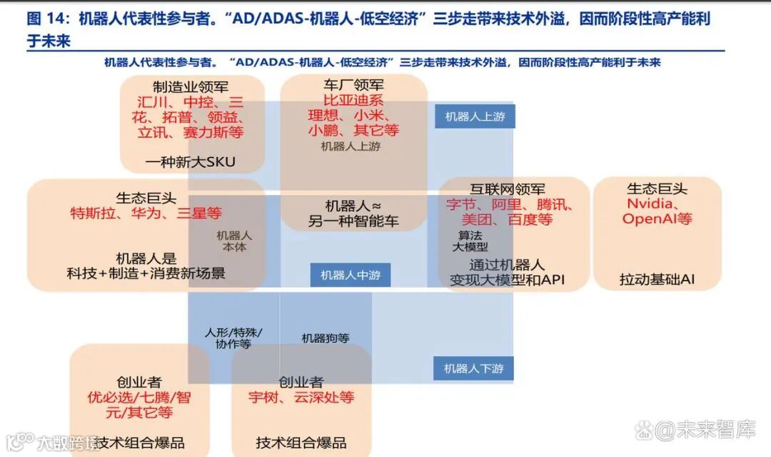 2025 年催化剂高频,主要体现在诸多力量新参与,会以“新成立机器人子公司”、 “新发布机器人”等方式亮相。一定有理性的投资人关注“短期产能会长期带来担忧”, 但之前已经论述,会“技术外溢”到其他领域,例如低空经济。1)第一类参与者是制造业领军,把机器人当做一项新产品大 SKU。例如汇川技术、 中控技术、三花智控、拓普集团、领益智造、立讯精密、赛力斯等。2)第二类参与者是车厂主机厂,把机器人当做 电动车/智能车后技术外溢的产物, 目前在探索阶段。例如比亚迪系(比亚迪、比亚迪电子)、小米、小鹏、其它领军等。3)第三类参与者是生态巨头。其中一部分把机器人当做 新场景,尤其是科技/制造/ 消费聚焦的新场景。例如华为、特斯拉、三星等。另一部分在机器人场景推广基础 AI。例 如英伟达、OpenAI。两者的区别是,前者以软硬一体化为主,后者以软件为主(英伟达 也是算法和软件为主的轻资产 GPU 公司) 4)第四类参与者是互联网领军,在机器人场景推广 AI 和云,变现大模型和 API。例 如字节跳动、阿里巴巴、腾讯集团、美团、百度等。5)第五类参与者是创业者。通过技术组合形成爆品。其中一部分是渐进式发展,通 过工业机器人/协作机器人的积累拓展到人形机器人,另一种是跳跃式尝试,做人形机器 人/机器狗/机器狼等创新。前者代表是优必选等,后者代表是宇树科技、云深处科技等。