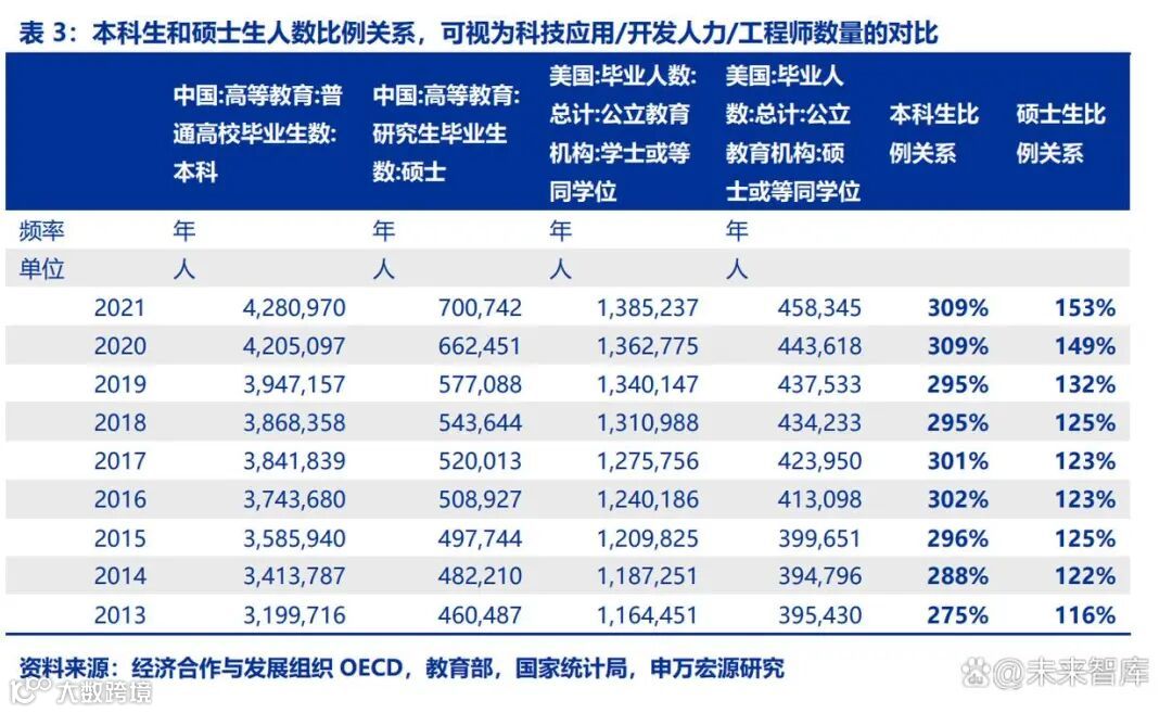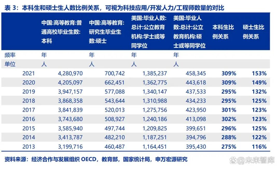 人口红利。一般认为中国在 20 世纪 90 年代至 21 世纪初进入人口红利期。1990 年 到 2010 年期间,中国 15—59 岁劳动年龄人口以年均 1.8% 的速度增长3,而非劳动年龄 人口的增长则基本停滞,同期年均增长率为 -0.2%。当前的工程师红利。中国的工程师红利大致从 20 世纪 90 年代开始显现,1999 年大 学扩招后进一步加速。工程师储备,我们可以用本科生、硕士生毕业人数的比例做近似。尽管教育质量、系别有差距,但误差不会显著。两者的比例关系为 2-3 倍、1-2 倍,恰与 双方第二产业工业增加值的规模比例接近。也有投资者担心,美国私立学校培养的人才未 统计进去。STEM 毕业生数量也是约每年百万人,这些信息可以加强计算的可靠性。
