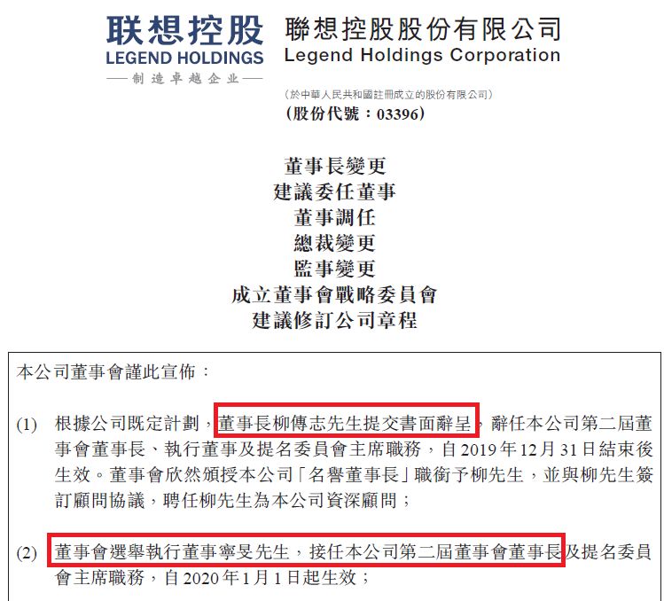 联想控股今日下午发布公告,柳传志卸任董事长,并担任名誉董事长!