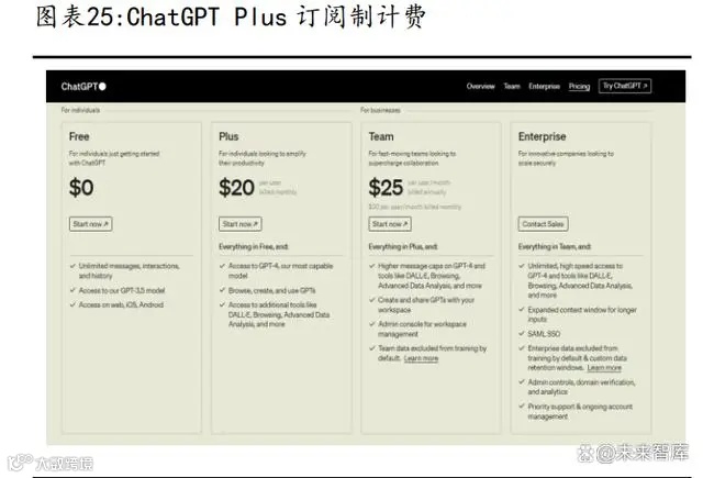 OpenAI2024 年成本支出预计达 85 亿美元,其中服务器租赁成本约 40 亿美元。OpenAI2024 年亏损预计约为 50 亿美元,收入中,面向普通用户的 ChatGPT Plus 订阅收入约 19 亿美元(收入占比 55%);面向大型企业客户的 ChatGPT Enterprise 约 7 亿美元收入(占比 21%);API 接口服务约 5 亿美元收入(占比 15%);面向中小企业和团队用户的 ChatGPT Team 约 3 亿美元收入(占比 8%)。OpenAI 仍处于高投入期,后续订阅收入增长潜力大。