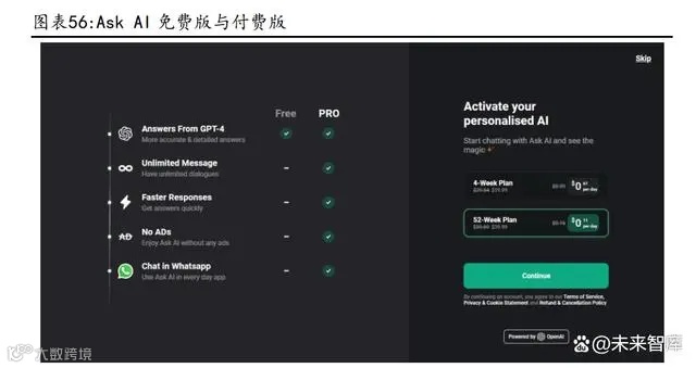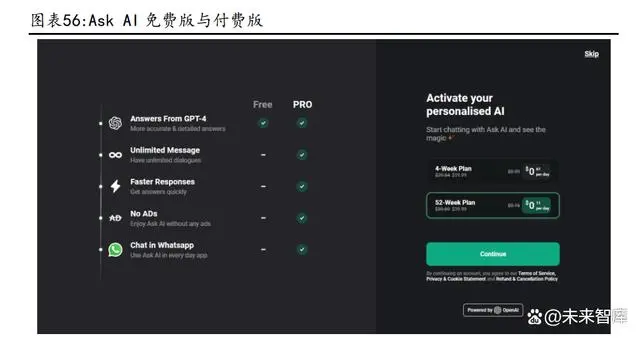 约 7 成应用仍处免费或试用以积累用户的阶段,约 3 成应用定价非公开。免费 版本和试用是 AI 应用吸引用户并促进应用落地的有效手段。约 50%的 AI 应用提 供免费版本,另有约 20%的应用提供免费试用。免费版本通常功能有限,但足以 让用户体验产品核心价值。免费试用期则允许用户在一定时间内免费使用完整功能,以便做出购买决策。面向个人和专业用户的 AI 应用倾向于公开定价, 而企业级应用当前较大比例仍为非标准化,一定程度的联合开发,并依据资源 投入的不同来协商定价。但随着 AI 应用市场的成熟和产品规模化落地,企业 级应用的定价信息可能会逐渐变得更加透明。
