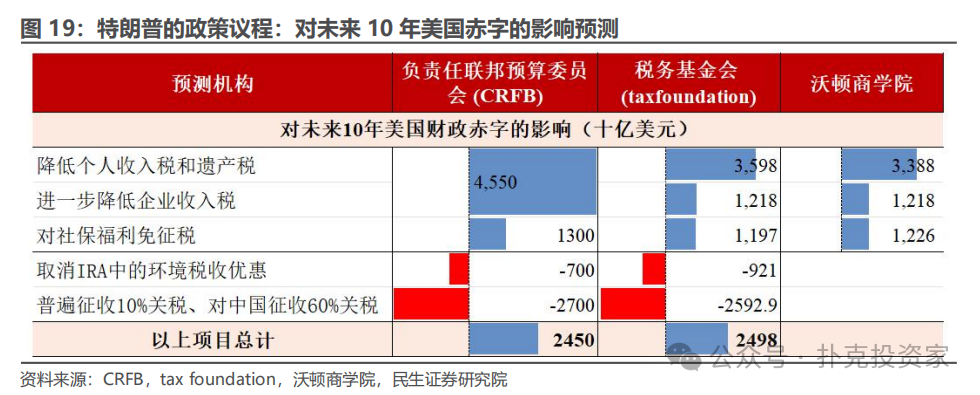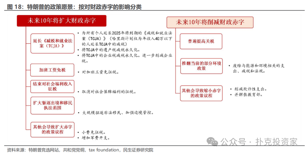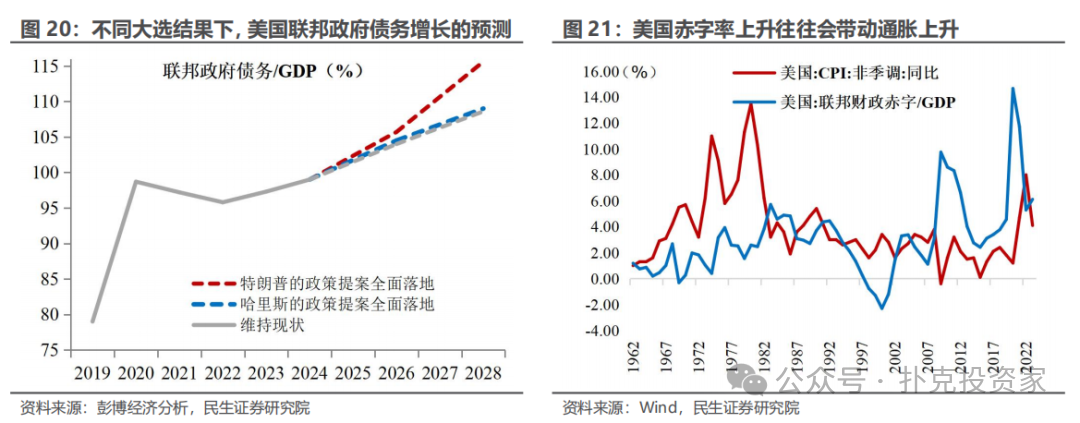 从财政的视角,如果出现“共和党横扫”的情景下,随着赤字扩大,“再通胀”的概率上升。特朗普大概率会在2025年优先推动减税法案,将刺激内需、给CPI造成较大上行压力;大规模驱逐移民和加征关税则会从供应端推升通胀。