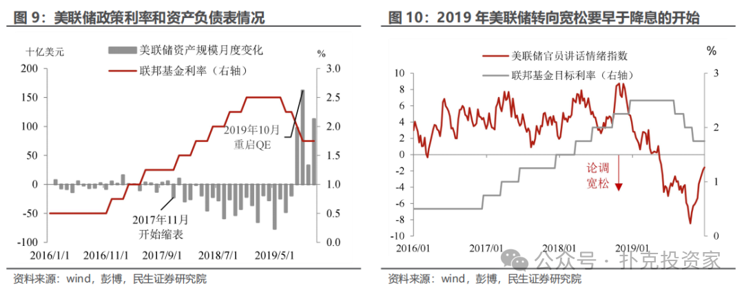 货币政策上的划分比较直观,2016年底至2018年处于加息(或者加息+缩表)的紧缩阶段,2019年政策转向宽松。不过,根据美联储官员讲话的倾向和市场预期的变化,我们选定2019年3月为宽松的节点(市场3月开始预期年内降息),要早于实际开始降息的7月。