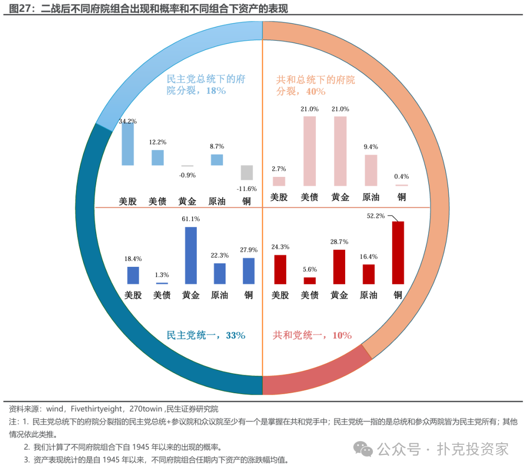 共和党之下的府院分裂情形出现的次数最多,但可能是市场最不愿遇到的情景。从历史经验看,这种情形下的避险情绪最浓(美债和黄金表现最好)。结合上一任期的复盘,大类资产的整体表现可能会好于2018年,但是弱于2019年: