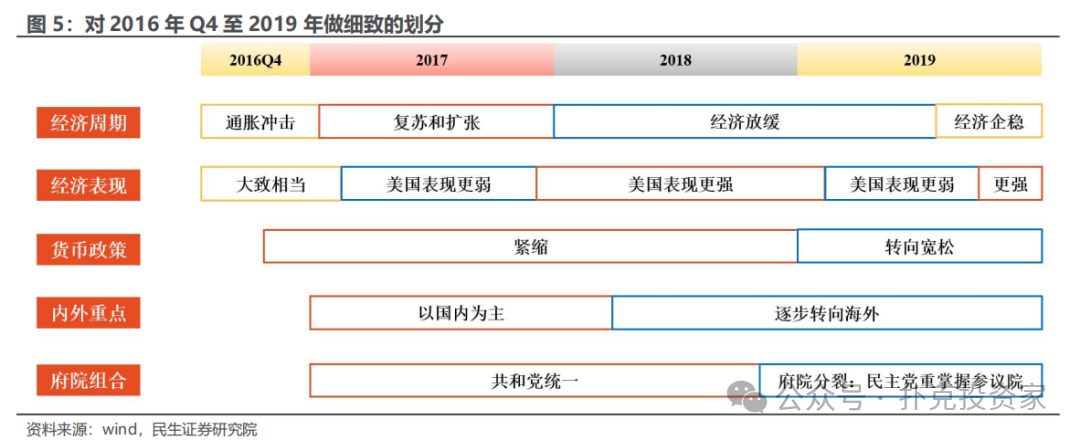 基于以上维度,我们把2016Q4至2019年分成五个部分,可以作为今年美国大选结果不同情景的参考: