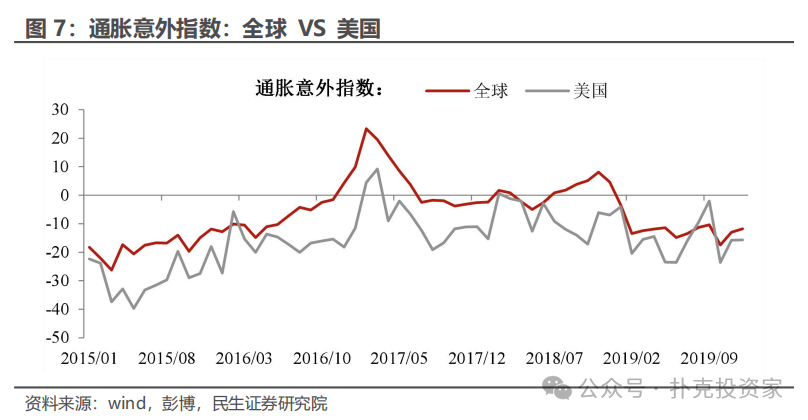 此外,2016年底至2017年初,全球和美国出现一轮明显的通胀冲击。由于当时全球经济处于企稳之初,市场对于通胀的担忧更大(甚至出现滞胀担忧),因此我们把2016年第四季度至2017年初定义为通胀冲击阶段。