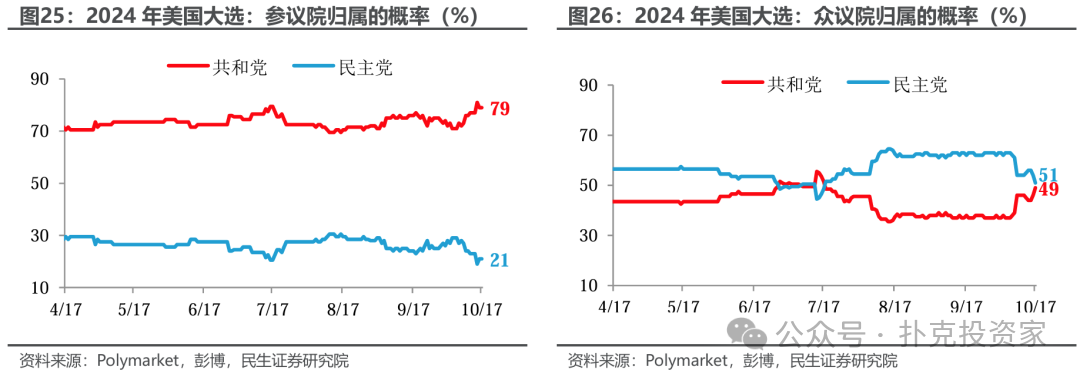 往明年看,除了总统之位外,可能更要考虑美国的府院组合。从目前的局势看,除了总统,最大的不确定性还是在众议院上,而参议院回到共和党手中的概率很大。因此,如果特朗普入主白宫,存在两种可能:共和党统一府院,或者总统(共和党)+参议院(共和党)+众议院(民主党)。