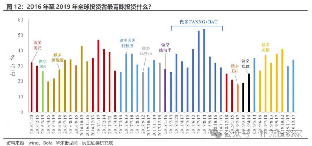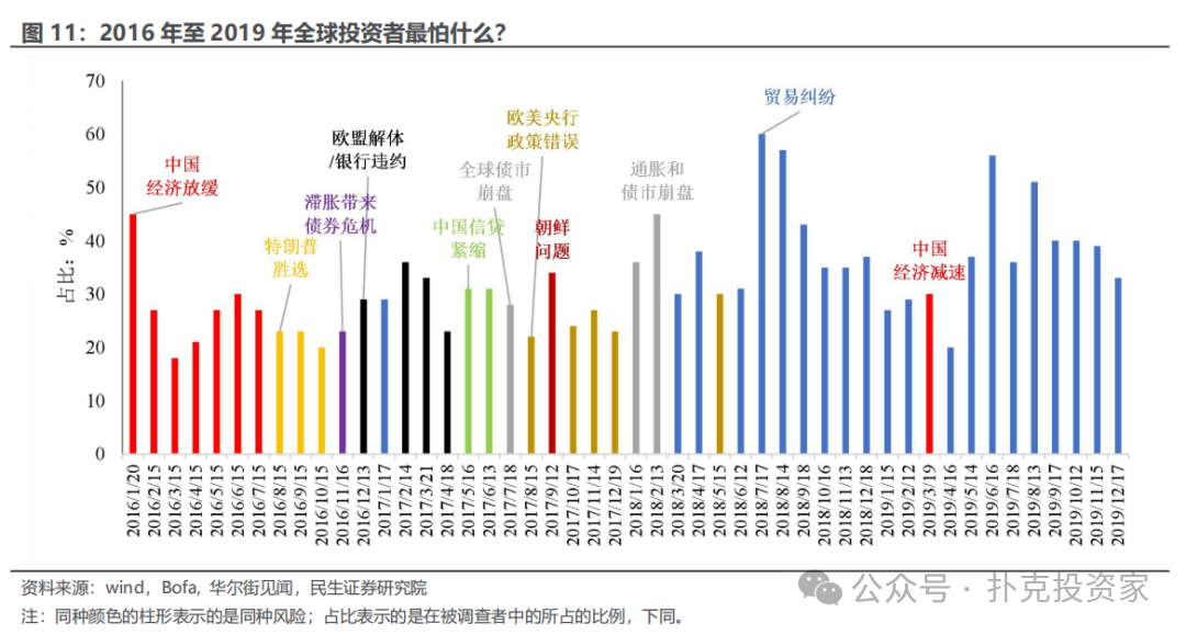 最后,我们加入市场的风险和预期进行查漏补缺。根据美国银行调查的数据,2018年下半年以及之后,贸易摩擦才成为最主要的市场风险,在此之前地缘和对政策失误的担忧更加突出。