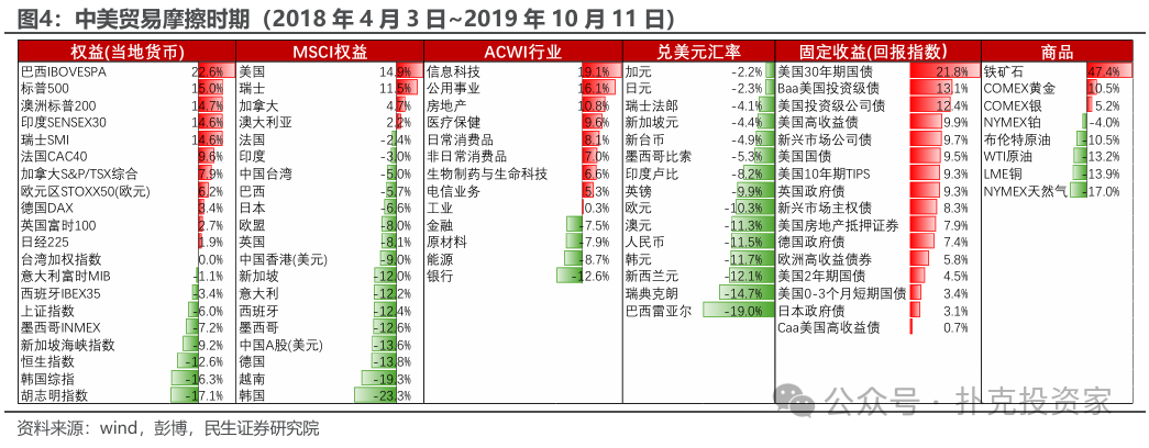 也可以截取中美贸易摩擦的典型时段(图4),也能得出应该做多美元、黄金和长久期发达国家国债,避开新兴市场股市的直观结论。