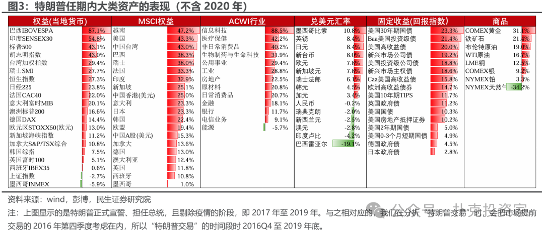 如果直接看特朗普上个任期内大类资产的表现(为了避免疫情的干扰,剔除2020年,时间为2017年至2019年),会看到股债“皆大欢喜”的场面(图3),而背后过程的曲折和复杂都被过滤。