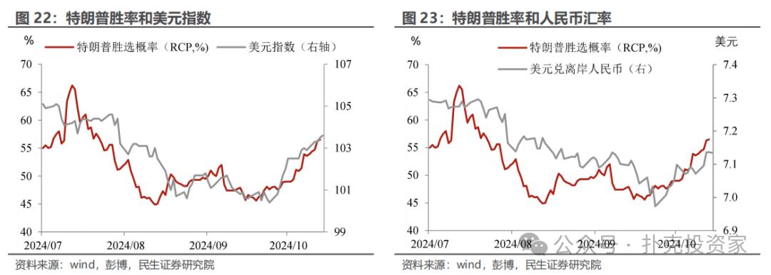 市场已经开始为特朗普重回白宫交“定金”了。9月底以来随着特朗普支持率的持续攀升,市场开始押注了,其中美元指数的大幅升值被视为代表,背后可能更多的是对特朗普政策再通胀内核和地缘“冲击”带来的担忧,对于贸易摩擦的定价并不多。
