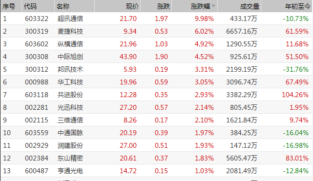 来看个股,今日早盘,5G概念持续拉升走强,超讯通信拉升封板报21.7元/股,麦捷科技、纵横通信、共进股份等跟涨。截至收盘,麦捷科技上涨6.02%,报9.34元/股。纵横通信、中际旭创涨幅超4%。