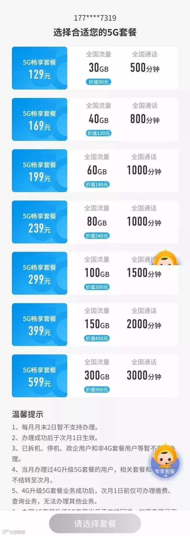 而中国联通的套餐则与电信类似,同样有7个档次。最低档为每月129元(30GB+500分钟通话),最高档次为每月599元(300GB+3000分钟通话)。