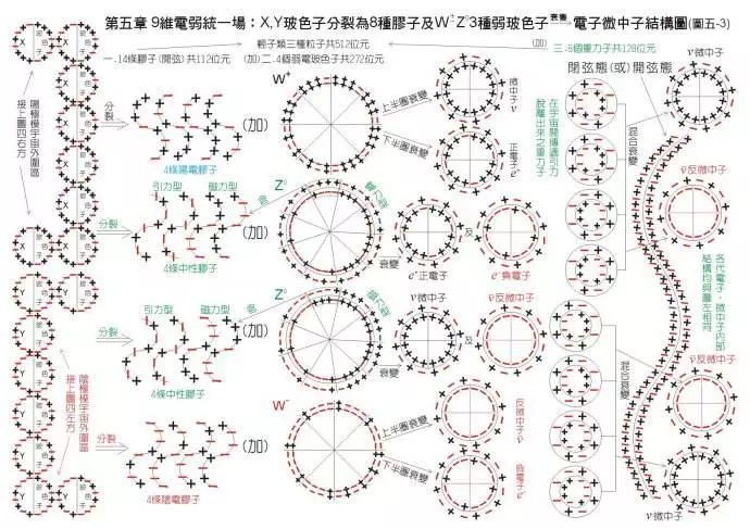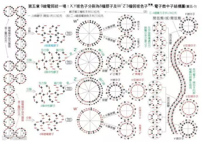 他们发现,在一个十一维的度量张量模型里,包含了自然界里几乎所有的粒子与作用力:爱因斯坦的重力理论、杨-米场与麦克斯韦尔场、还有夸克与轻子。如图所示: