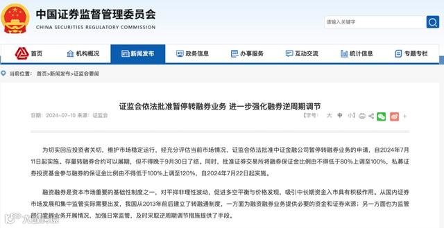 中国证券金融股份有限公司发布通知,为维护市场稳定运行,进一步加强逆周期调节,经中国证监会同意,本公司决定自2024年7月11日起暂停转融券业务。存量转融券合约可以依法存续和展期,但不得晚于2024年9月30日归还了结。(财联社)