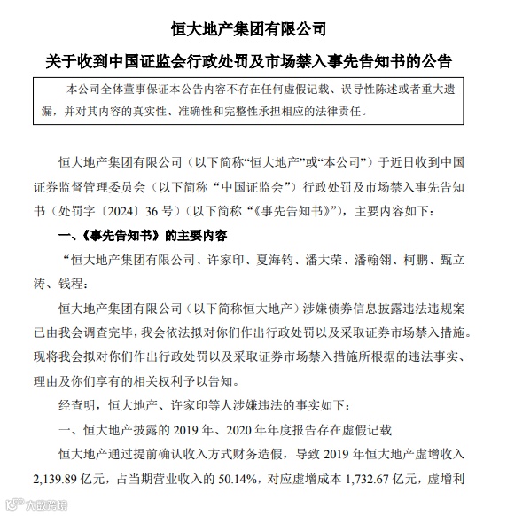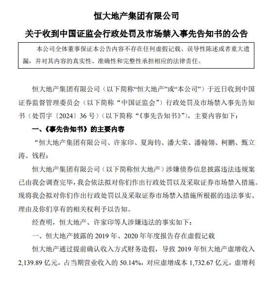 3月18日晚间,恒大地产发布了关于收到中国证监会行政处罚及市场禁入事先告知书的公告,恒大地产、许家印以及多位曾在恒大地产任职的管理层,受到监管层重重责罚。告知书显示,经查明,恒大地产、许家印等人涉嫌违法的事实主要有三项:恒大地产披露的2019年、2020年年度报告存在虚假记载,两年恒大地产虚增收超5600亿元;恒大地产公开发行公司债券涉嫌欺诈发行;恒大地产未按规定及时披露相关信息。证监会责令恒大地产改正,给予警告,并处以41.75亿元的罚款;对许家印给予警告,并处以4700万元的罚款。