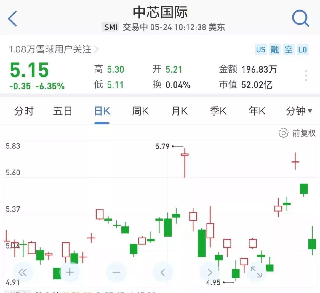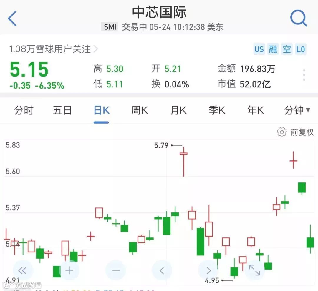 5月24日中芯国际(SMI)美股开盘后跌幅超过4%,近10日日均成交量约28万股;相比,中芯国际港股近10日均成交量达4330万股