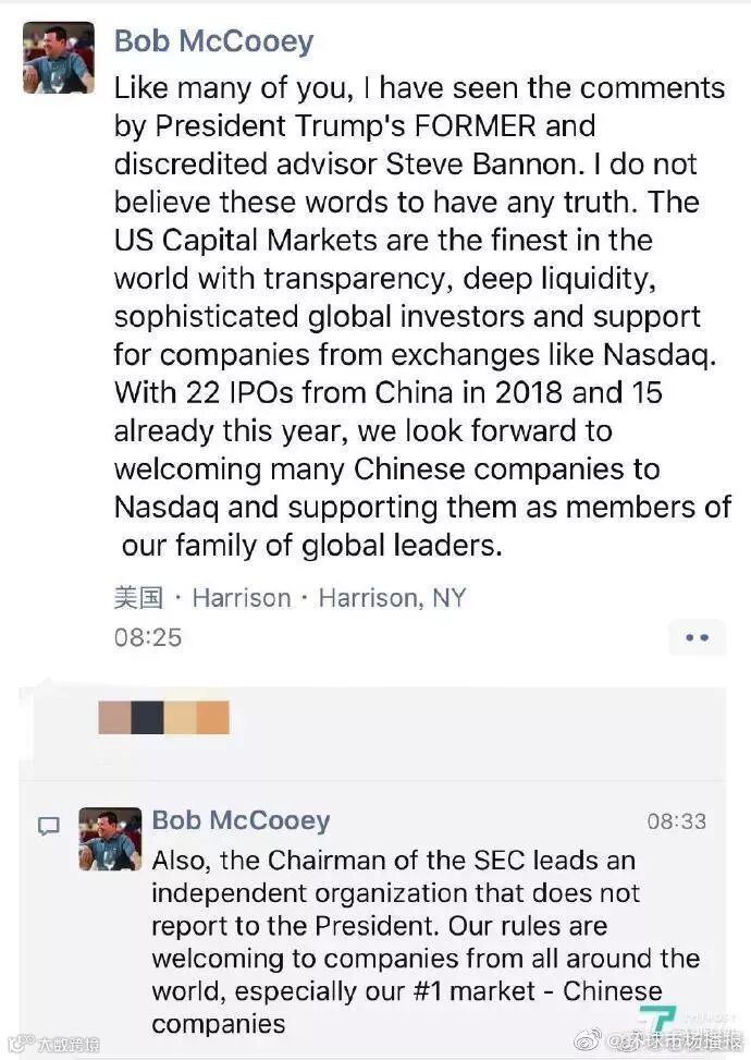“像许多人一样,我看到了特朗普总统名誉扫地的前顾问史蒂夫·班农发表的言论。我认为这些话没有任何道理可言。美国资本市场是世界上最好的资本市场,具有透明度、深度流动性,拥有成熟的全球投资者以及纳斯达克等交易所对公司的支持。在2018年,来自中国的IPO有22起,今年已经有15起IPO。我们期待看到大量中国公司来到纳斯达克,我们视中国公司为我们全球领导人大家庭的一员,并且将给予他们支持。”麦库伊说。