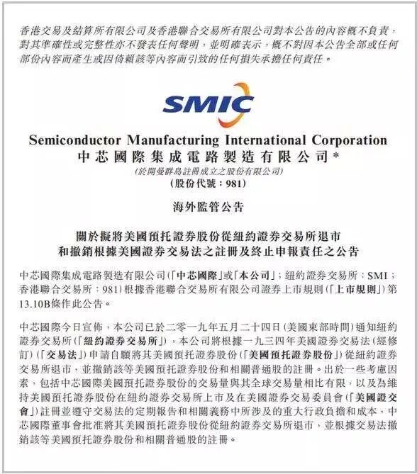 中芯国际5月24日发布公告宣布,本公司已于二零一九年五月二十四日(美国东部时间)通知纽约证券交易所,本公司将根据一九三四年美国证券交易法(经修订)申请自愿将其美国预托证券股份从纽约证券交易所退市,并撤销该等美国预托证券股份和相关普通股的注册。