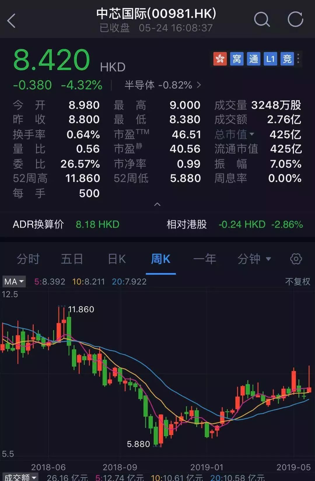 近期受中美贸易战的严峻形势影响,中芯国际作为在美股上市的国产芯片代工领头羊,股价波动幅度较大。