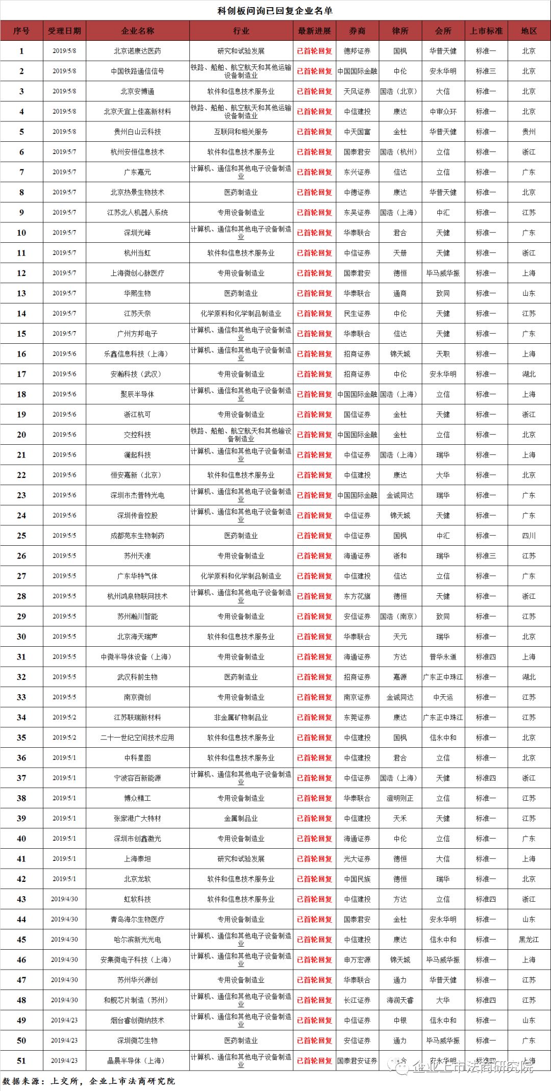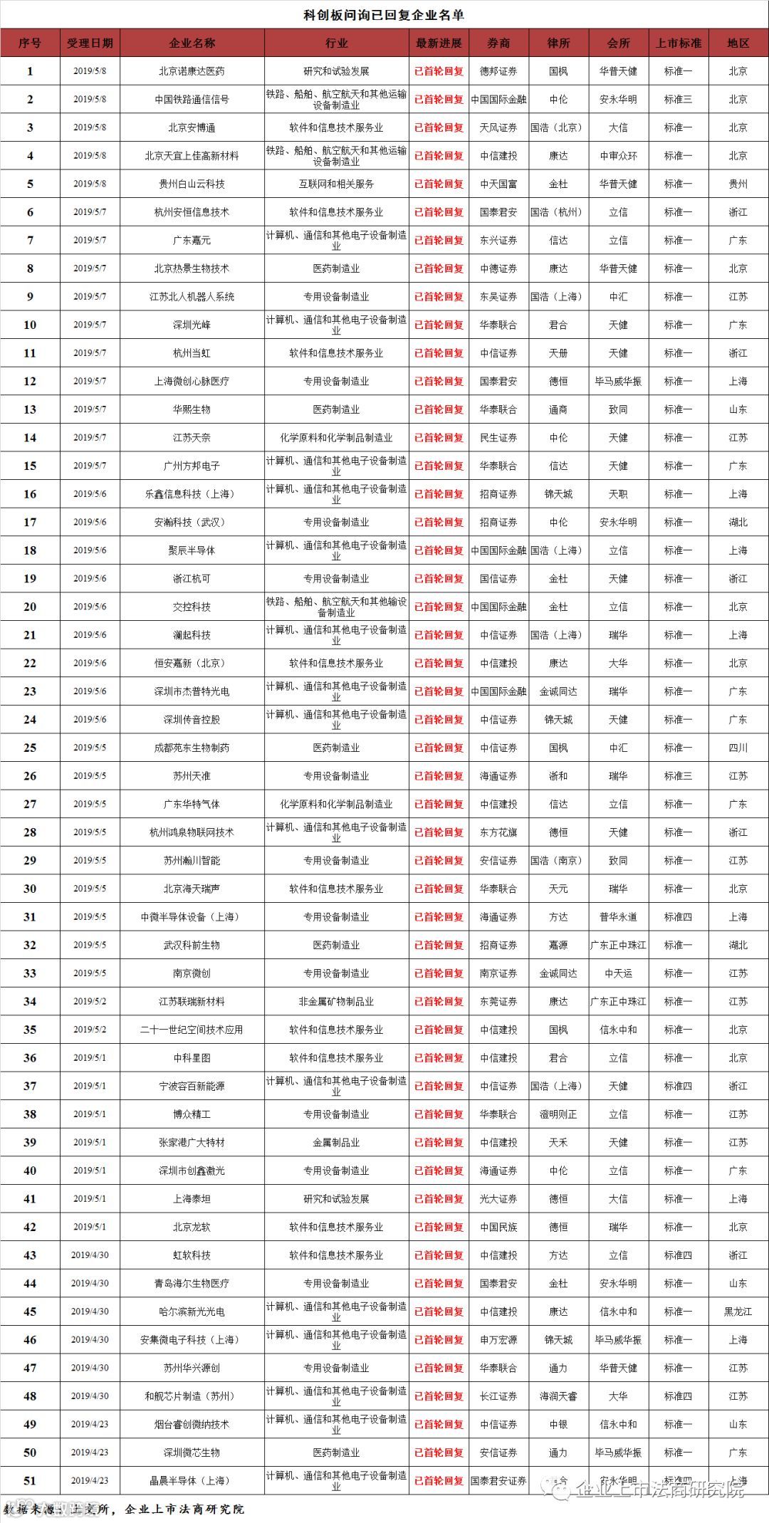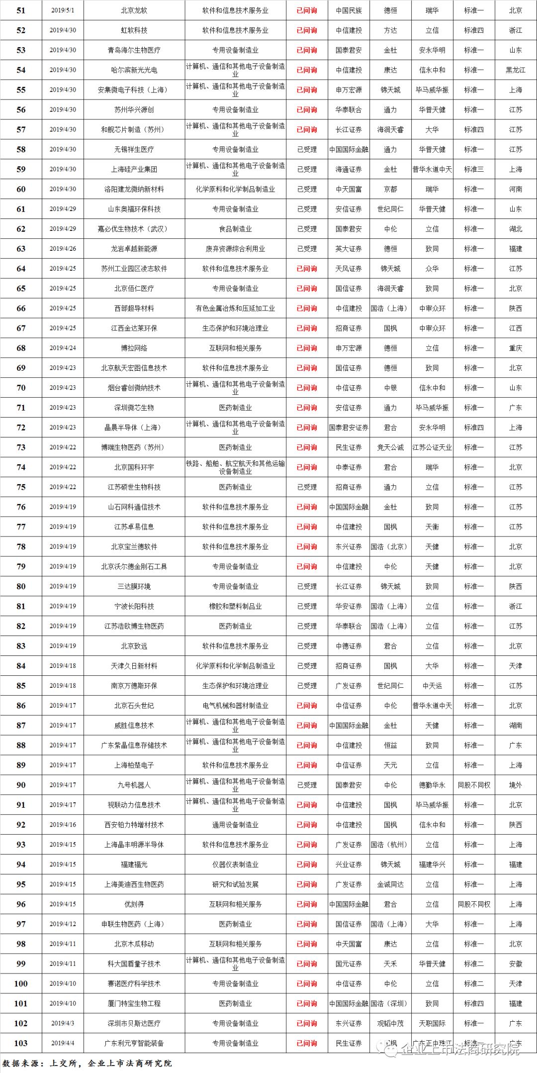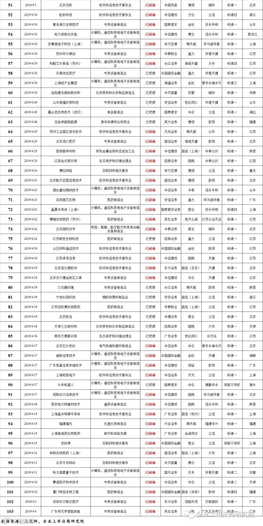 截至发稿,科创板已受理企业103家,其中83家处于已问询状态,这83家中有51家处于问询已回复状态。排名方面: