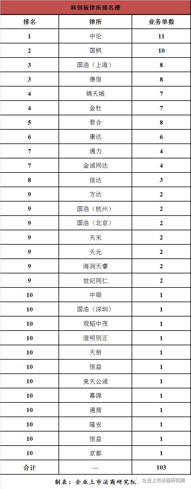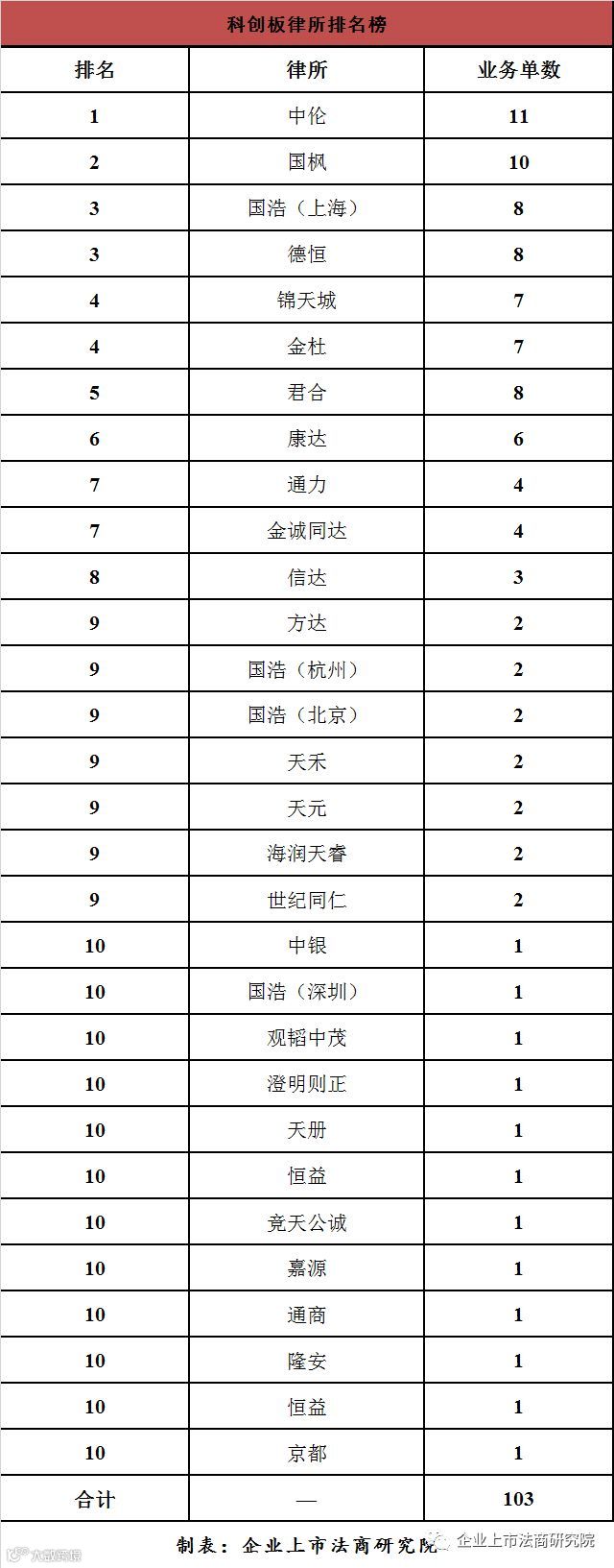 从律师事务所看,排在前三名的分别是:中伦(11家)、国枫(10家)、国浩(上海)(8家);