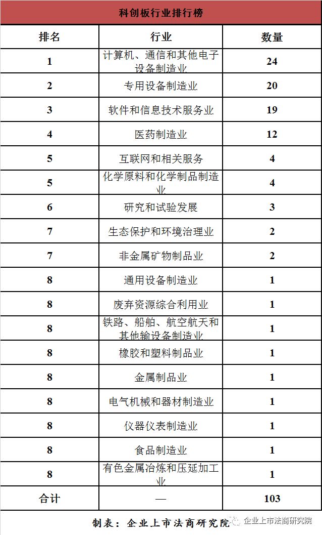 从行业看,排在前三名的分别是计算机、通信和其他电子设备制造业(24家)、专用设备制造业(20家)、软件和信息技术服务业(19家)。