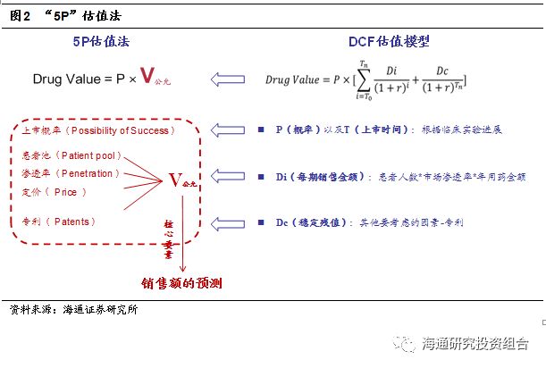 考虑到绝对估法值引入太多的参数且不够直观,不适用于二级市场,我们采用“5P”估值法进行创新药估值。“5P”即上市概率(Possibility of Success)、患者池(Patientpool)、渗透率(Penetration)、定价(Price)和专利(Patents& exclusivity)。其中,上市概率反映药品成功上市的可能性,患者池、渗透率、定价反映产品市场空间,专利反映了产品的生命周期。这5个因素对创新药公司的未来现金流影响重大。