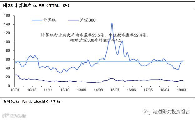 纵向来看,从2010年到2019年4月30日,计算机行业历史平均市盈率(TTM)在55.5倍,中位数在52.4倍;截至2019年4月30日,计算机行业市盈率(TTM)在57.5倍,处于历史平均水平。横向来看,相比沪深300的历史平均12.6倍市盈率(TTM),计算机行业的平均溢价率在4.5倍左右。