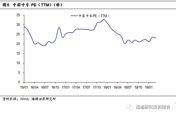 案例分析:中国中车。中国中车是全球规模最大、品种最全、技术领先的轨道交通装备供应商。2018年公司铁路装备和城轨与城市基础设施收入达1553.32亿元,占收入比例达70.90%。从公司铁路装备收入与铁路固定资产投资、公司城轨收入与城轨投资看,具有较大关联,且近年来处于稳定发展阶段,因此从铁路装备龙头公司角度看,在平稳发展期先进轨交装备公司适用PE估值法。