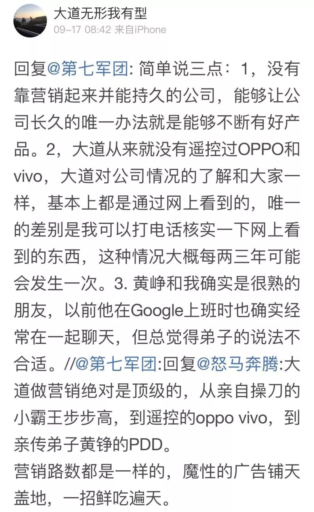 2、我从来就没有遥控过OPPO和vivo,对公司情况的了解和大家一样,基本上都是通过网上看到的,唯一的差别是我可以打电话核实一下网上看到的东西,这种情况大概每两三年可能会发生一次。