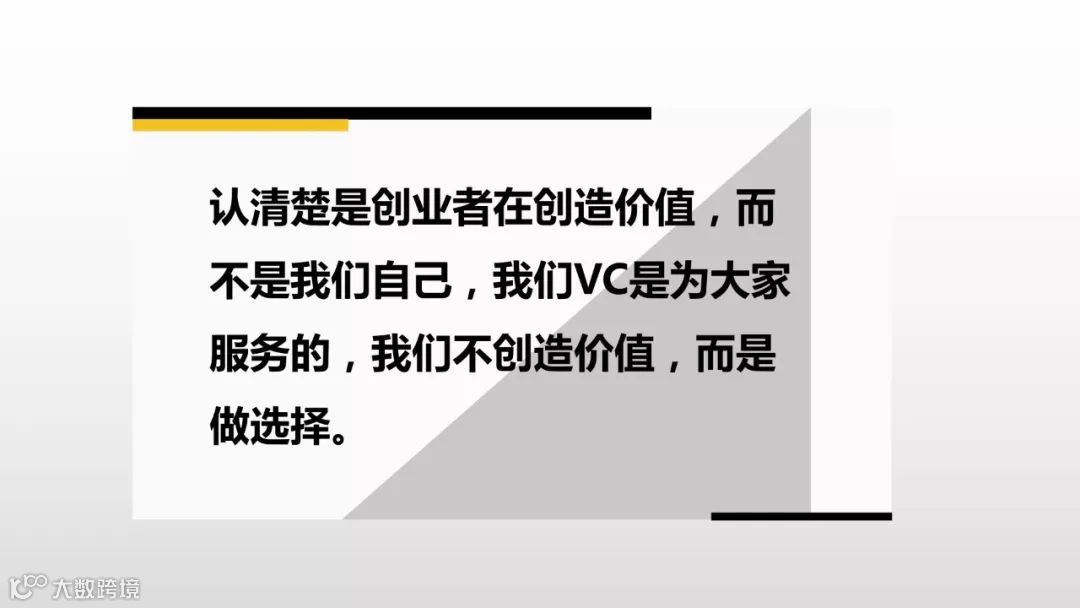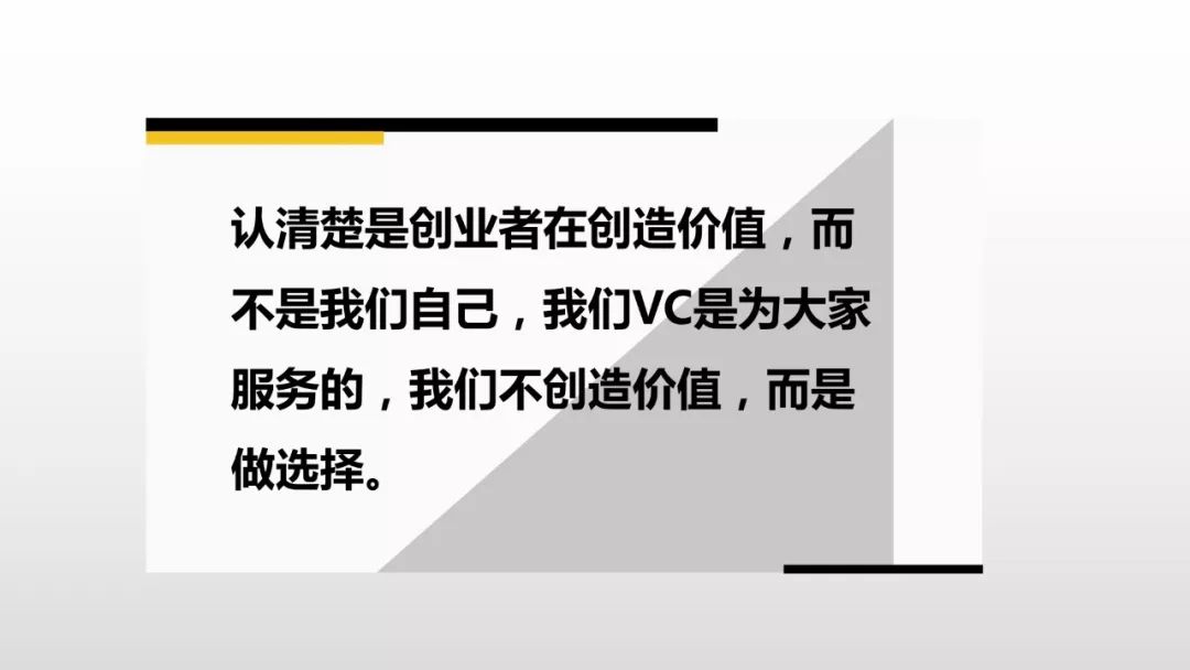 认清楚是创业者在创造价值(而不是我们自己),我们(VC)是为大家服务的,我们不创造价值,而是做选择。