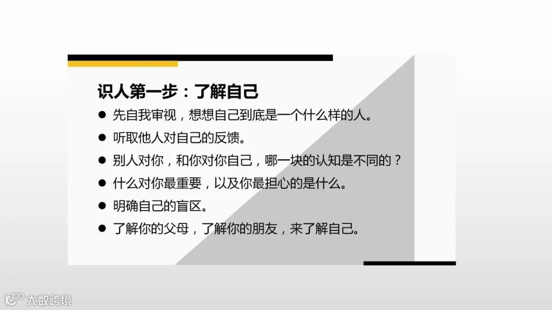 我觉得以上几条内容都是“了解自己”的途径,但这是一个非常艰难的过程。我今年四十多岁了,我对自己认识的过程还在不断变化,包括从他人的反馈中才逐渐明白和了解自己。
