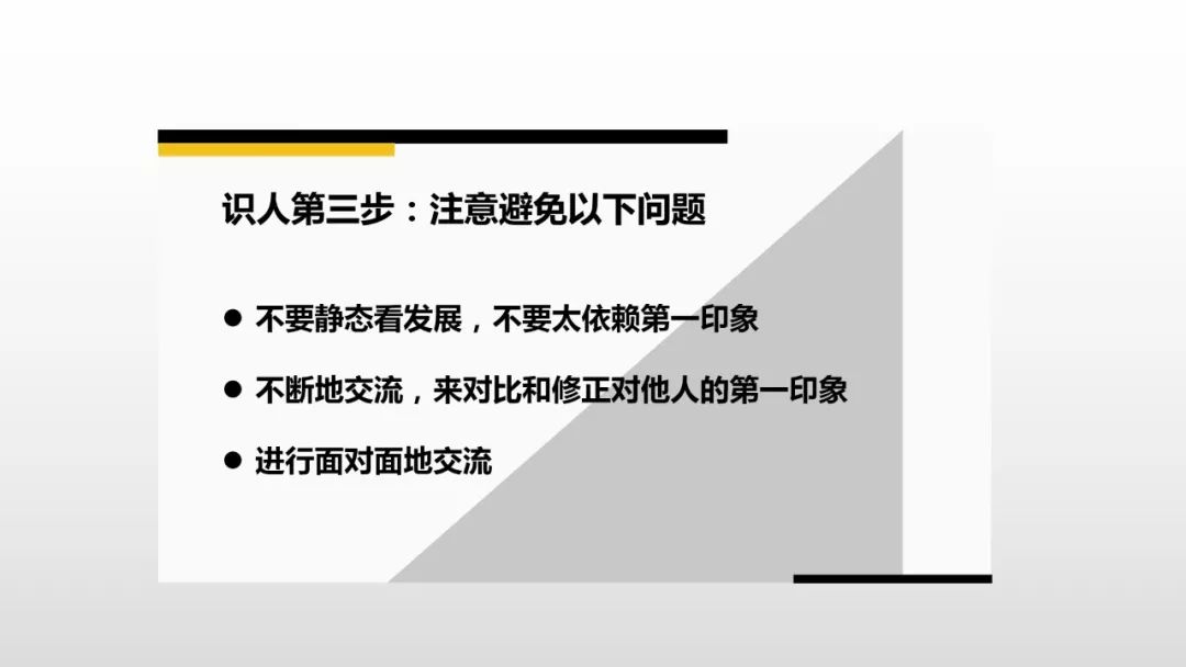 不要静态看发展,不要太依赖第一印象。投资也好,见人也好,都很容易在三五分钟之内形成了一个特别强的印象。但是,你一定要不断反观这个印象,要通过不断地交流,来对比和修正对他人的第一印象。