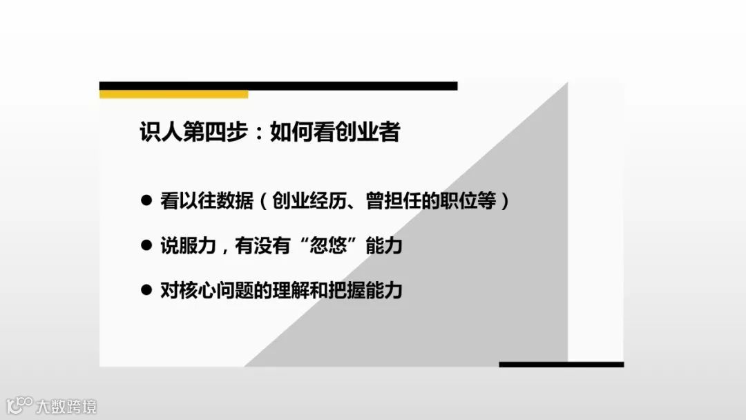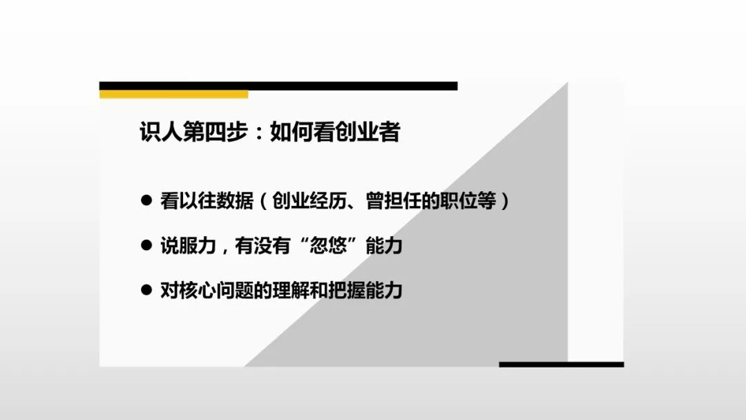5、看人是一个很持续的过程,我们要不断地去比较他之前说的和现在是不是一致,尤其是我们会经常见一些创业者,今年见,明年见,你要问他们,去年的 forecast 怎么样了。