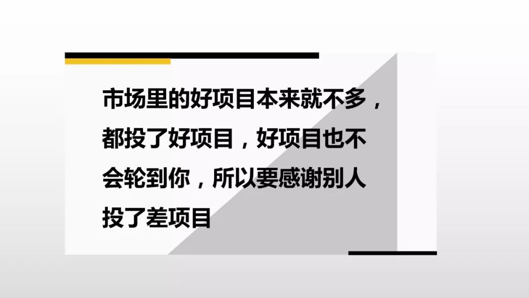 人们倾向于说自己投了什么好项目,但很少讲自己失败的项目,更不会提自己想投、但被同事说服否定掉的不靠谱的项目。反过来,人们可能会本能的想到别人投了很差的项目,但其实别人投的项目当初并没有那么糟,而且市场里的好项目本来就不多,都投了好项目,好项目也不会轮到你,所以要感谢别人投了差项目。