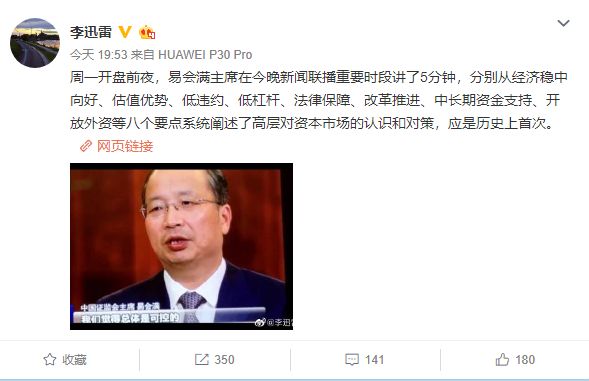 对于易会满的采访谈话,中泰证券首席经济学家李迅雷表示,周一开盘前夜,易会满主席在今晚新闻联播重要时段讲了5分钟,分别从经济稳中向好、估值优势、低违约、低杠杆、法律保障、改革推进、中长期资金支持、开放外资等八个要点系统阐述了高层对资本市场的认识和对策,应是历史上首次。